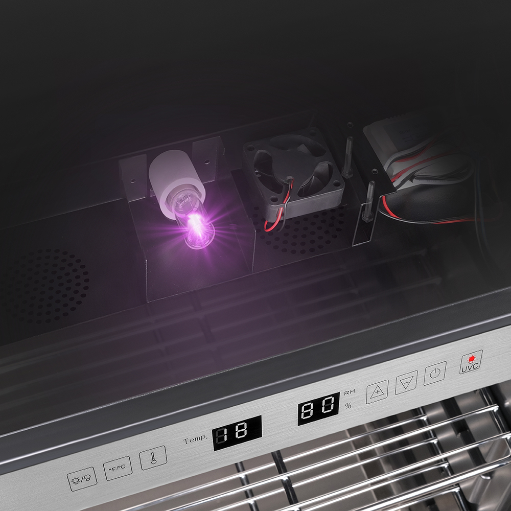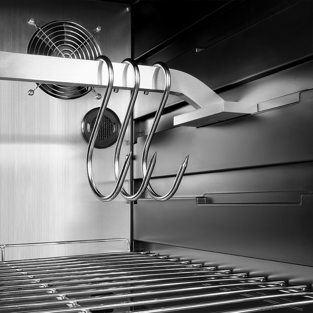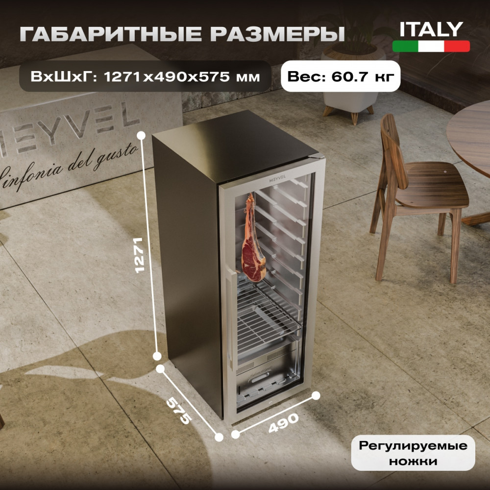Внутреннее оснащение холодильника продумано до мелочей. Регулируемые ножки позволяют выровнять устройство, а встроенные крюки, поднос для соли и полки из нержавеющей стали облегчают размещение и сушку содержимого. Резервуар для воды дает возможность контролировать уровень влажности в диапазоне от 60 до 85%, что важно для равномерного вызревания.